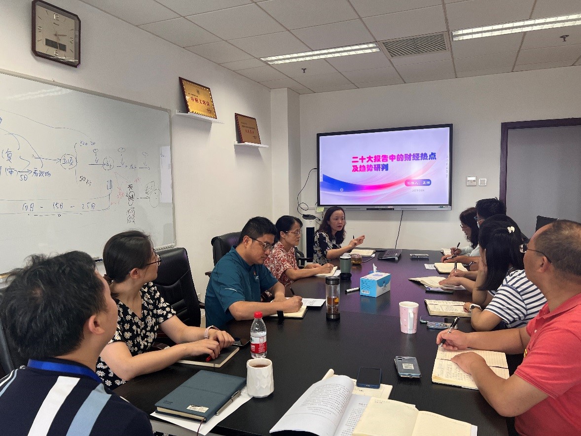 专题学习会上,孟锦同志以《党的二十大报告中的财经热点词汇和趋势思考》为题,为大家带来了一场生动的主题教育党课。她向大家介绍了党的二十大报告的主题和目标等基本情况,并对报告中的“中国式现代化”“高质量发展”“高水平社会主义市场经济体制”“实体经济”“乡村振兴”“区域协调发展”“高水平对外开放”“房住不炒”“共同富裕”等财经热点词汇进行详细解读和趋势思考。